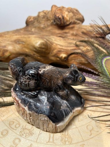 Diese vollständig aus versteinertem Holz gearbeitete Marderfigur vereint die uralte Kraft der Erde mit der wendigen Intelligenz des Waldes.